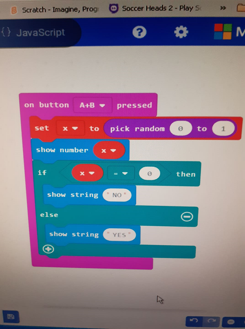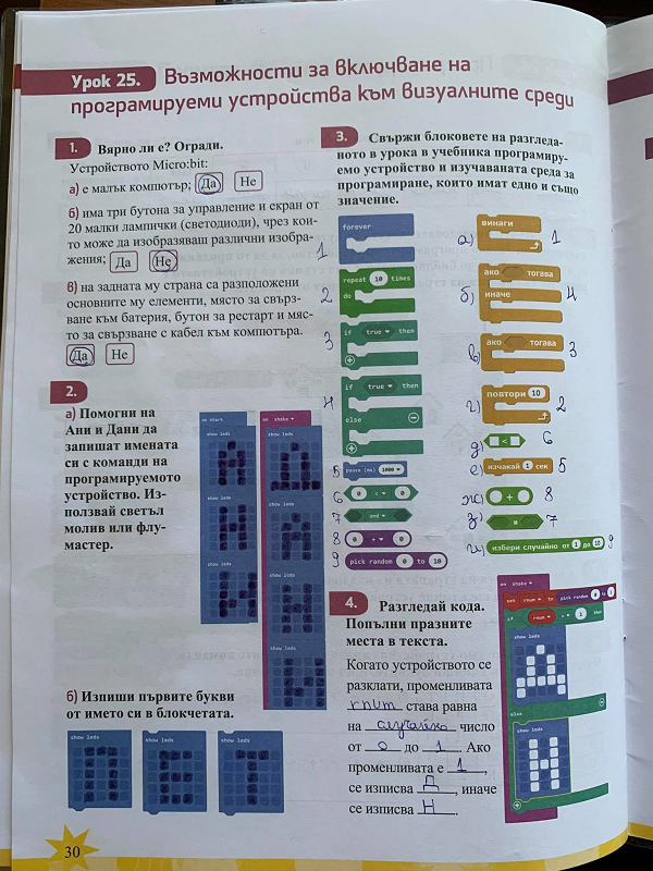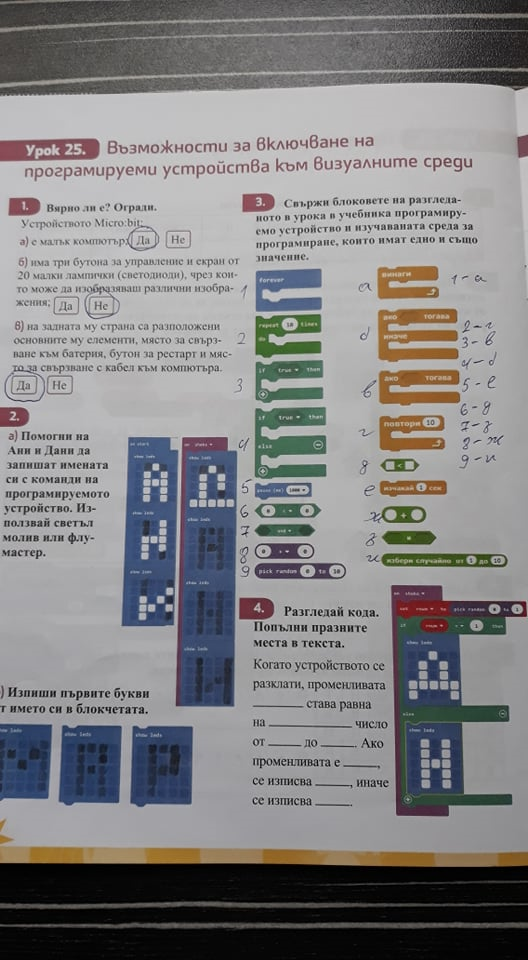 Децата свикнаха да работят по този начин, дойде ред да се преподава урок „Включване на програмируеми устройства към визуална среда“. Съществуват различни програмируеми устройства. Разбира се нашето училище закупи микрокомпютърните платки – Microbit. Чрез онлайн час показах устройството, обясних начина на работа и как се свързва с компютъра. След което им показах работа през платформата makecode.microbit.org. Демонстрирах им как мигат светлинките и как се изписват букви върху платката. Направихме сравнение на блоковете за програмиране на Scratch и на makecode.microbit.org и установихме, че те си приличат. Предоставим им план и кратко ръководство за домашна работа. Интересни и уникални проекти направиха четвъртокласниците, в симулатора на makecode.microbit.org.