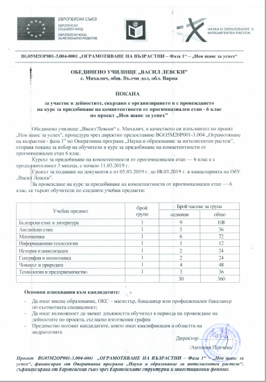 На 11.03.2019 г. /понеделник/ от 14.00 ч. започва втори етап от курса за придобиване на компетентности от прогимназиалния етап по проект „Нов шанс за успех“.