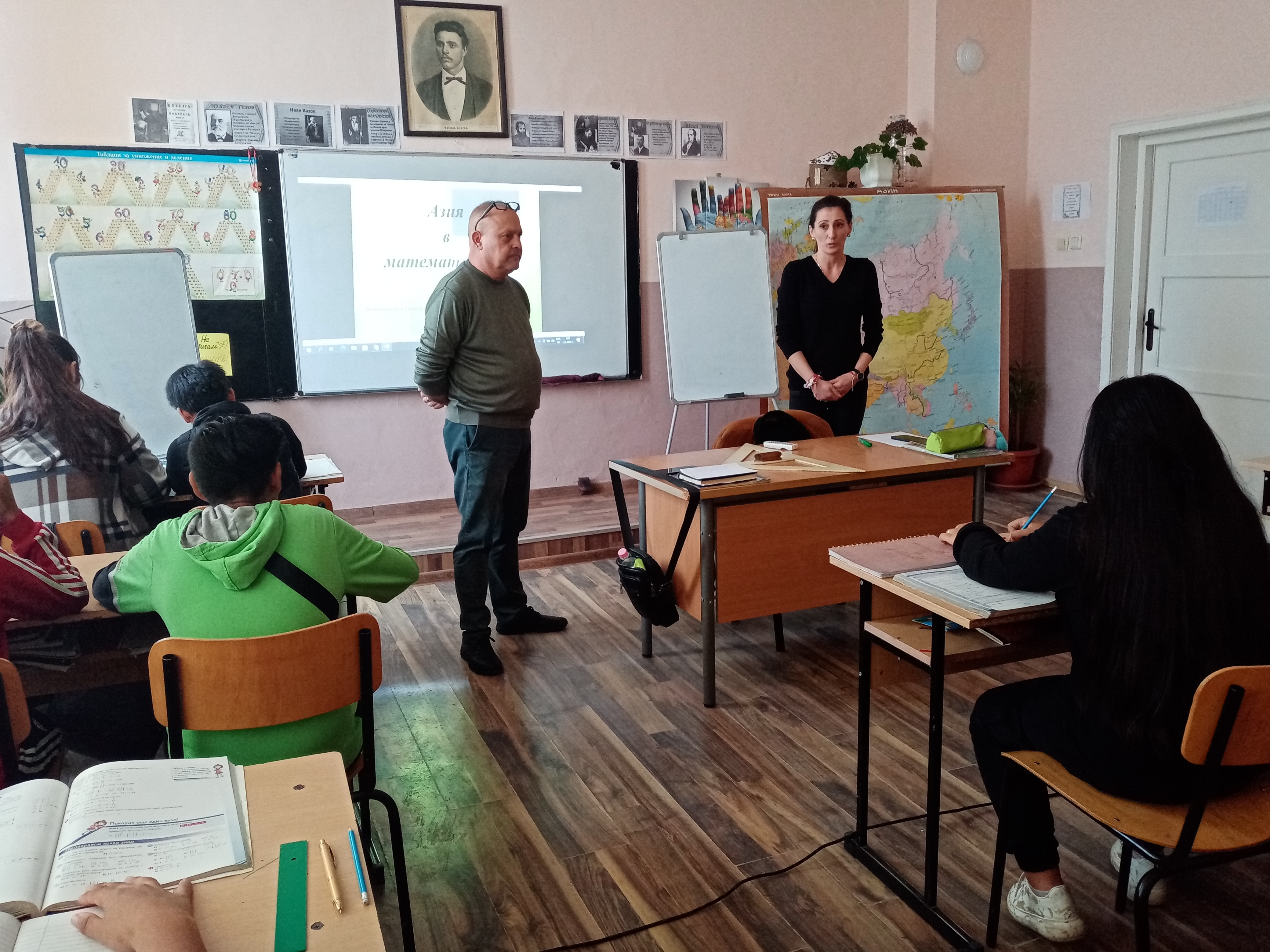 Учителите по математика г-жа Ангелова и по география и икономика г-н Мехмедов проведоха бинарен урок с учениците от VІ клас. Чрез познанията си за основни географски понятия учениците решаваха задачи за приложение на действията с рационални числа. Представени бяха интересни факти за разнообразния релеф на континента Азия от най-високата точка на земята – връх Еверест до най-ниската точка на сушата – Мъртво море.
