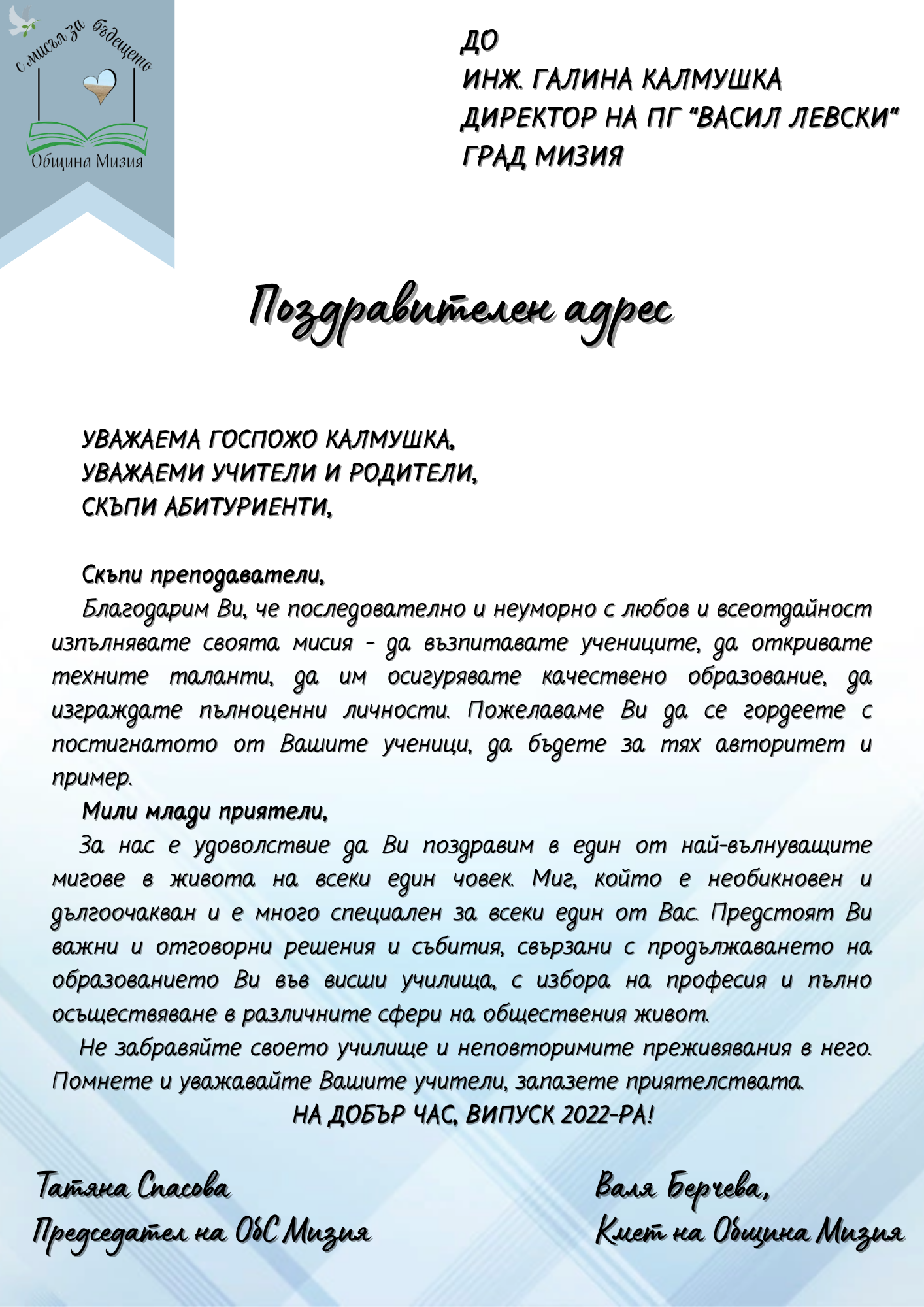 ПГ „Васил Левски“ – гр. Мизия, община Мизия, област Враца организира: