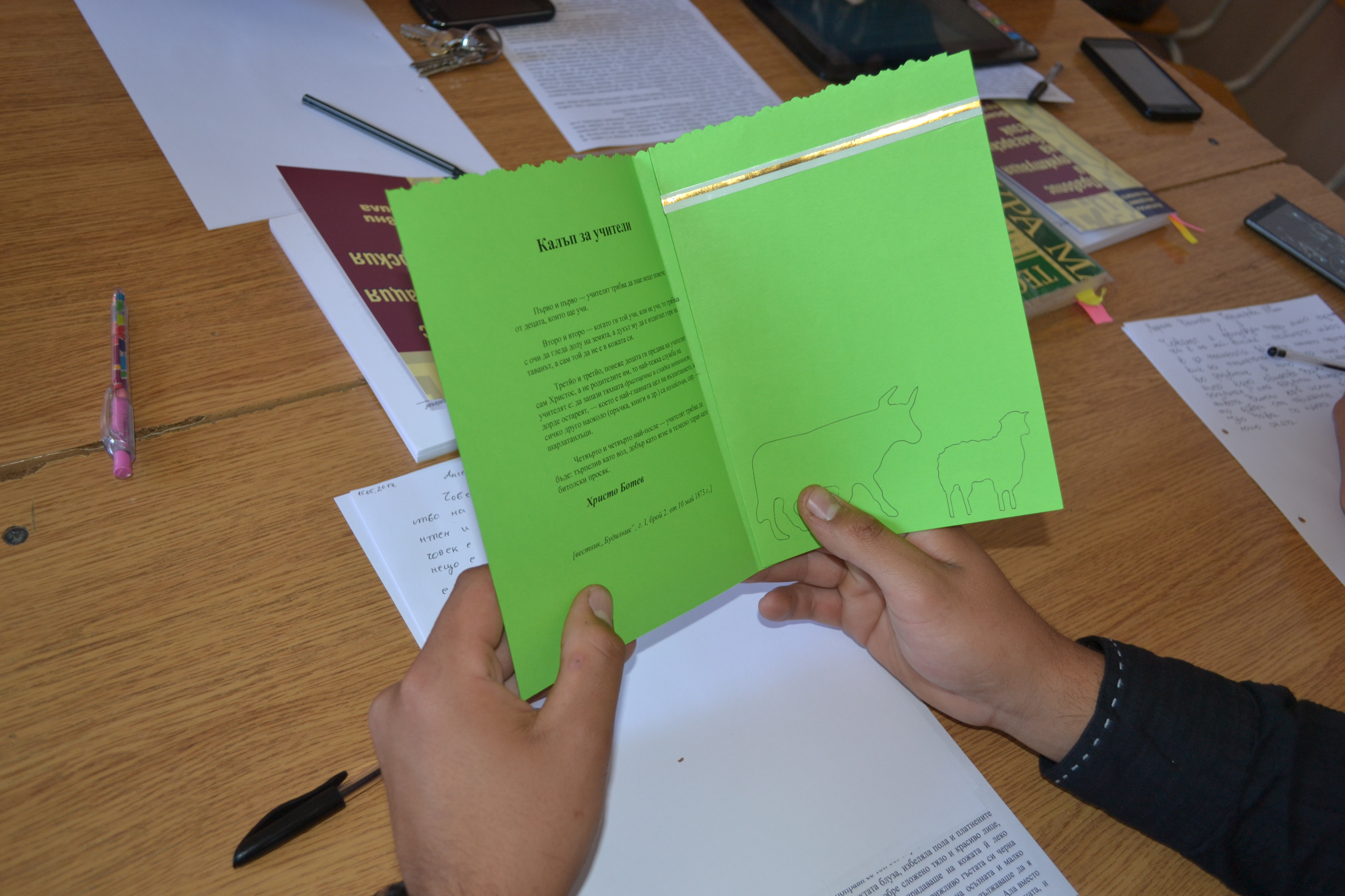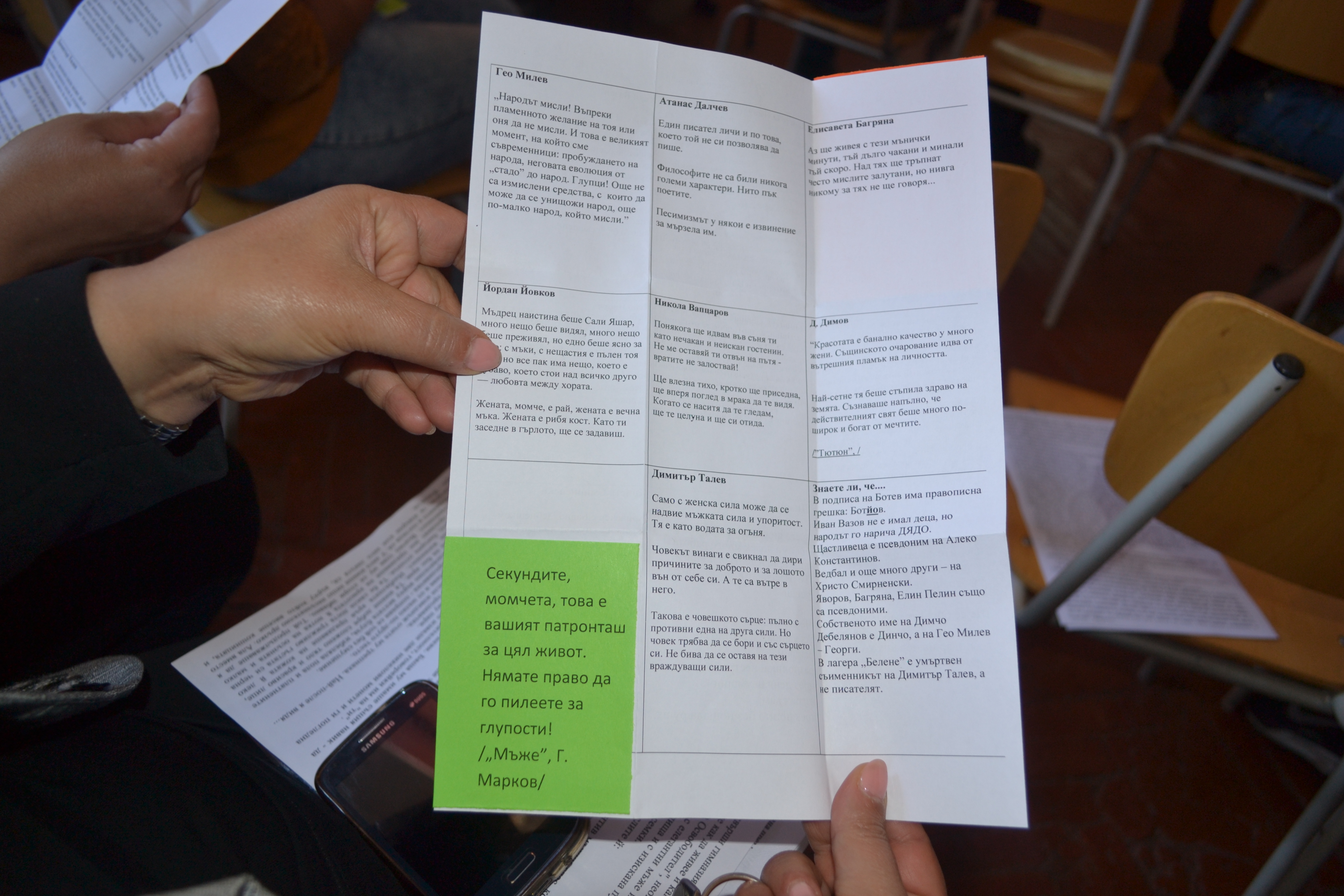 Учениците от групата с обучителни затруднения „Език и бъдеще” по проекта „Твоят час” осъзнато оформиха посланието си до следващите поколения ученици в ПГТ: „Литературата и матурата са важни за личното бъдеще на всеки ученик. Но за България е най- важно да има сърца, изпълнени с почит към националните ценности и слава.”