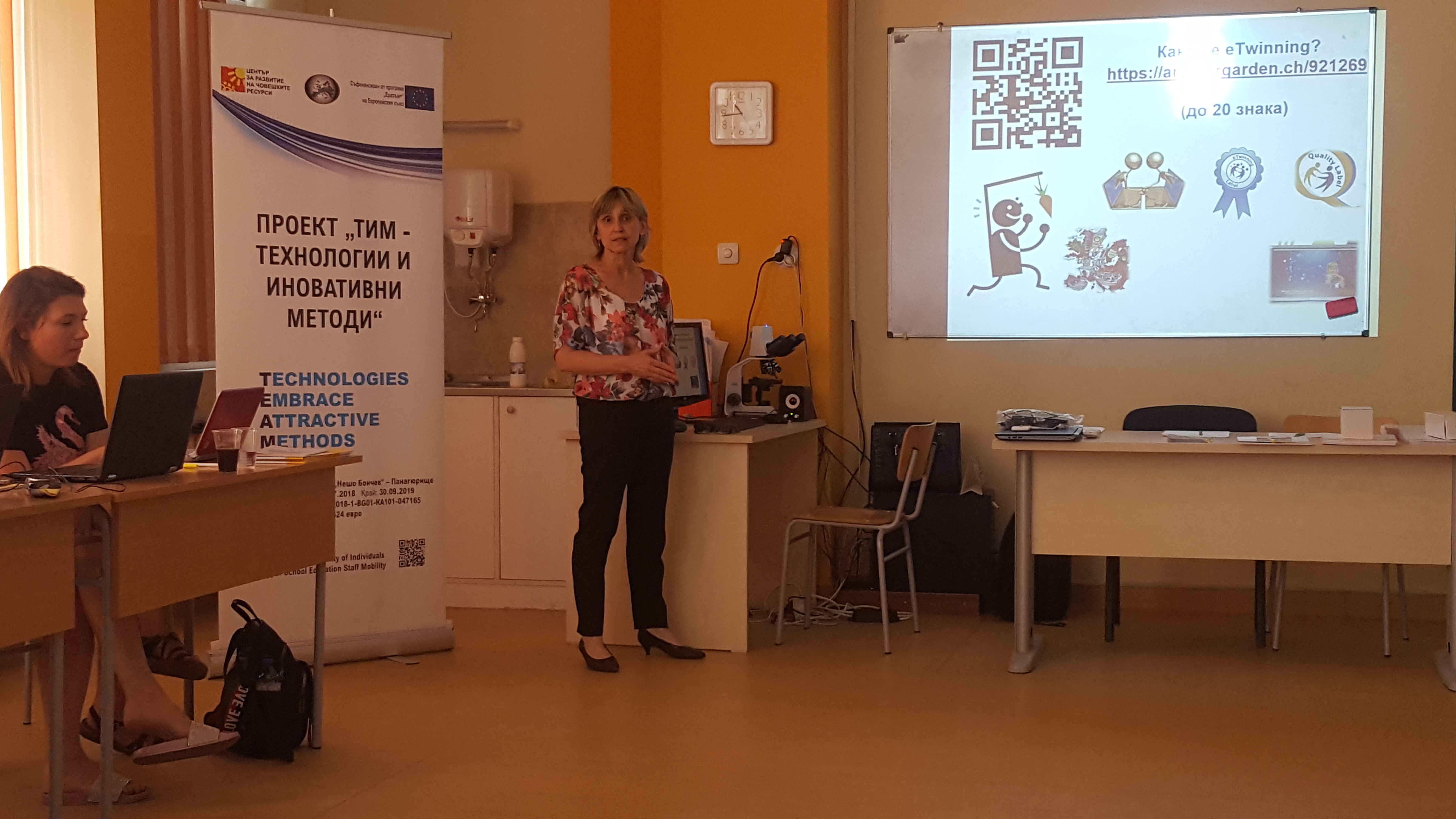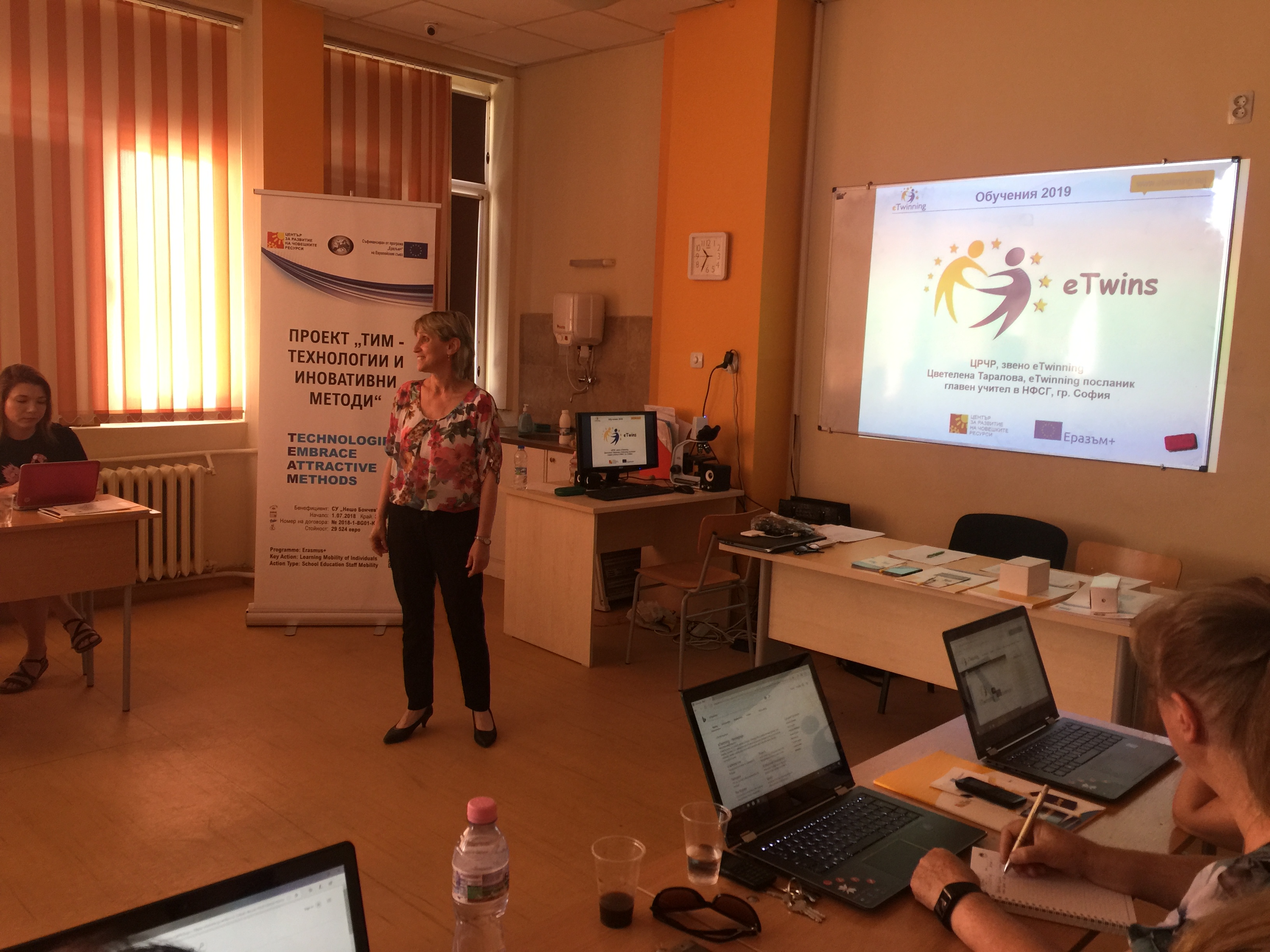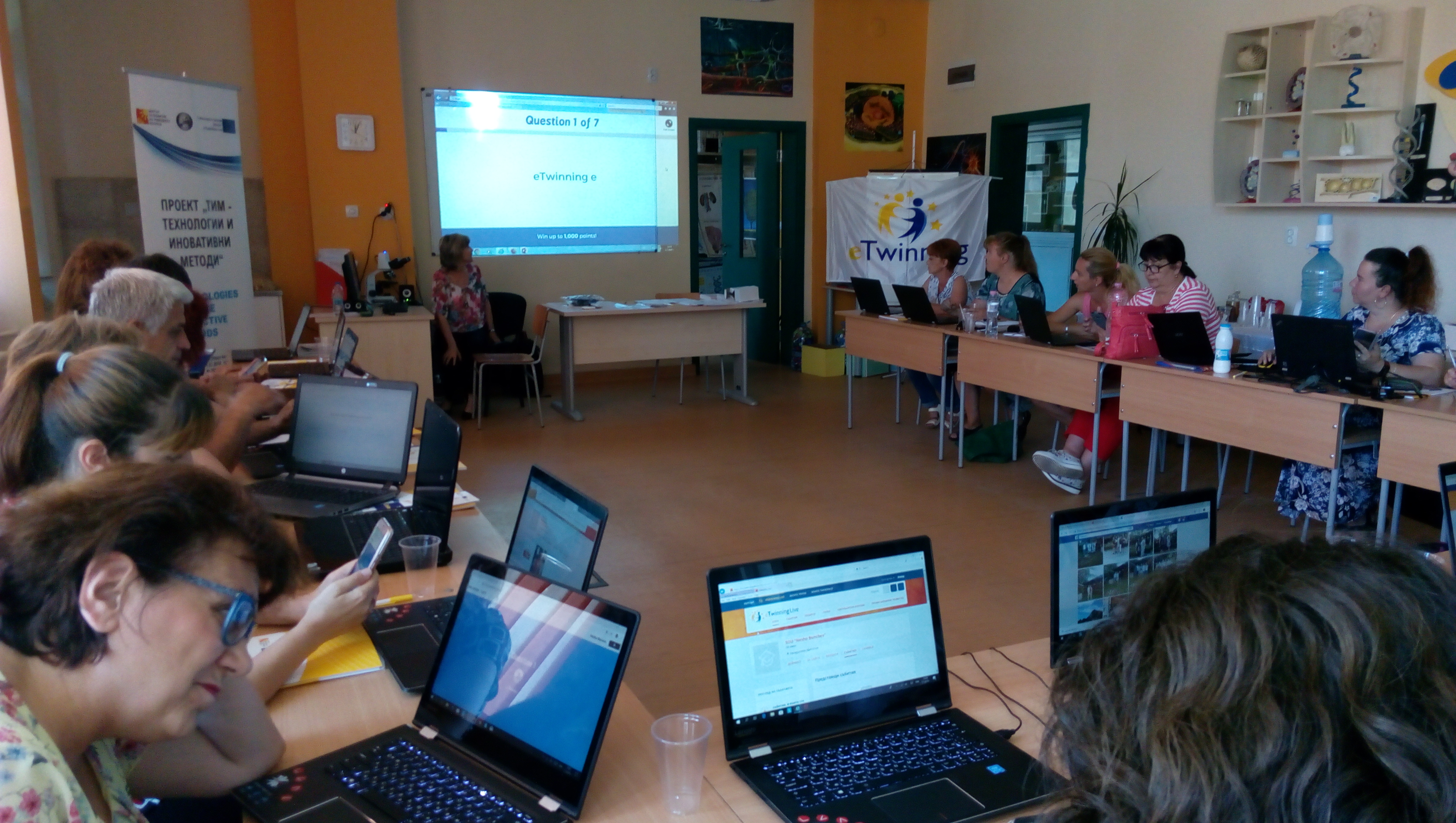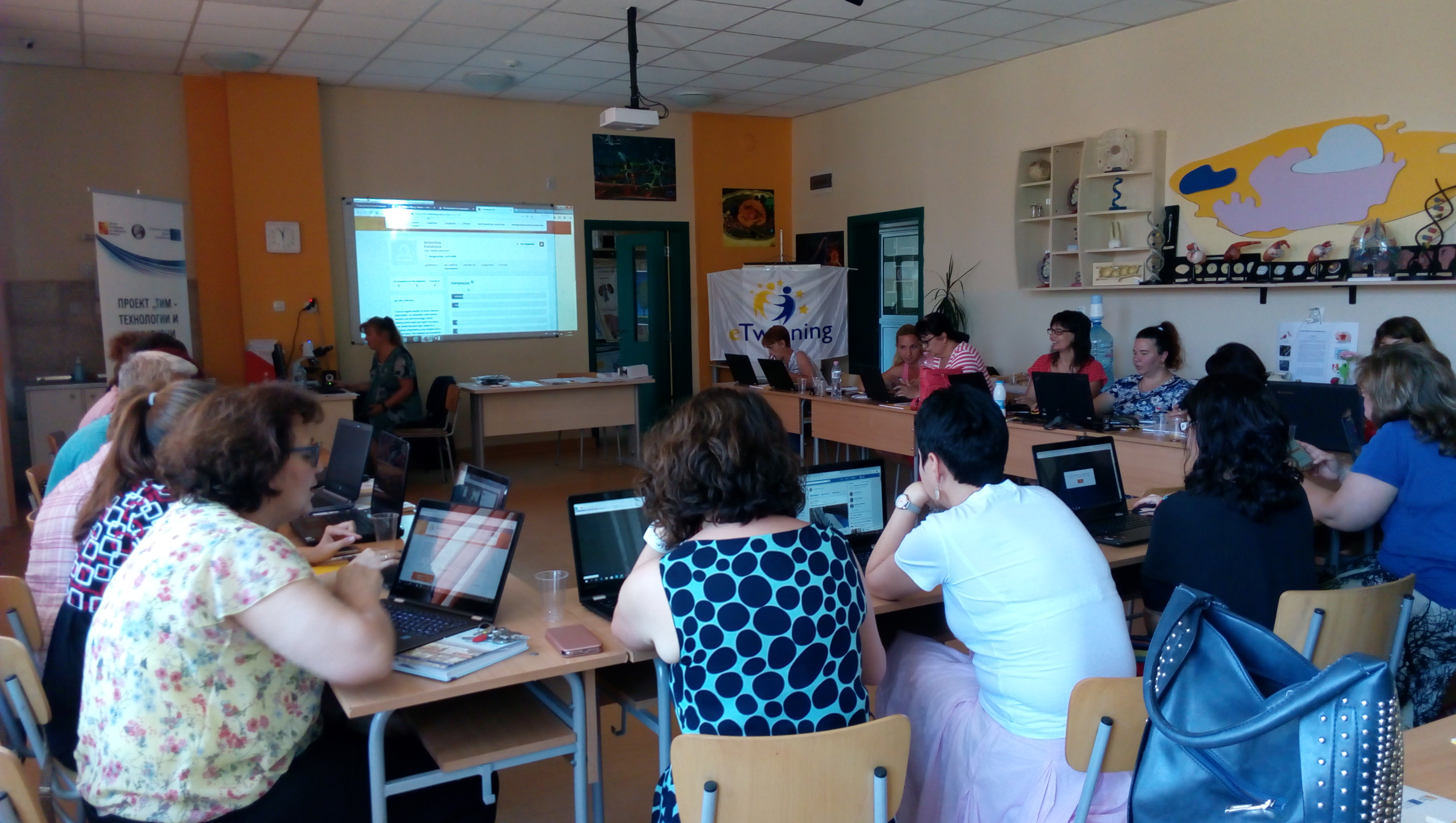 На 1 юли в СУ „Нешо Бончев“- Панагюрище се проведе четвърта вътрешно-училищна квалификация – обучение на тема „eTwinning за начинаещи“. Обучението бе водено от Цветелена Таралова – eTwinning посланик към ЦРЧР, по програма Еразъм+ със съдействието на Силвия Бобекова, координатор по проект „ТИМ – Технологии и Иновативни Методи”.