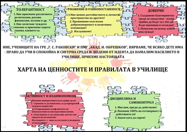 На 05.12.2012 година психологът на ГРЕ „Г. С. Раковски” Калинка Мишинова и педагогическия съветник на ПМГ „Ак. Н. Обрешков” Венета Колева проведоха работен семинар с представители на Ученическите съвети на двете училища. Учениците бяха запознати с резултатите от изследванията, посветени на проблема с насилието и тормоза и осъществени в двете гимназии. Участниците разработиха и приеха Харта на ценностите и правилата в училище.