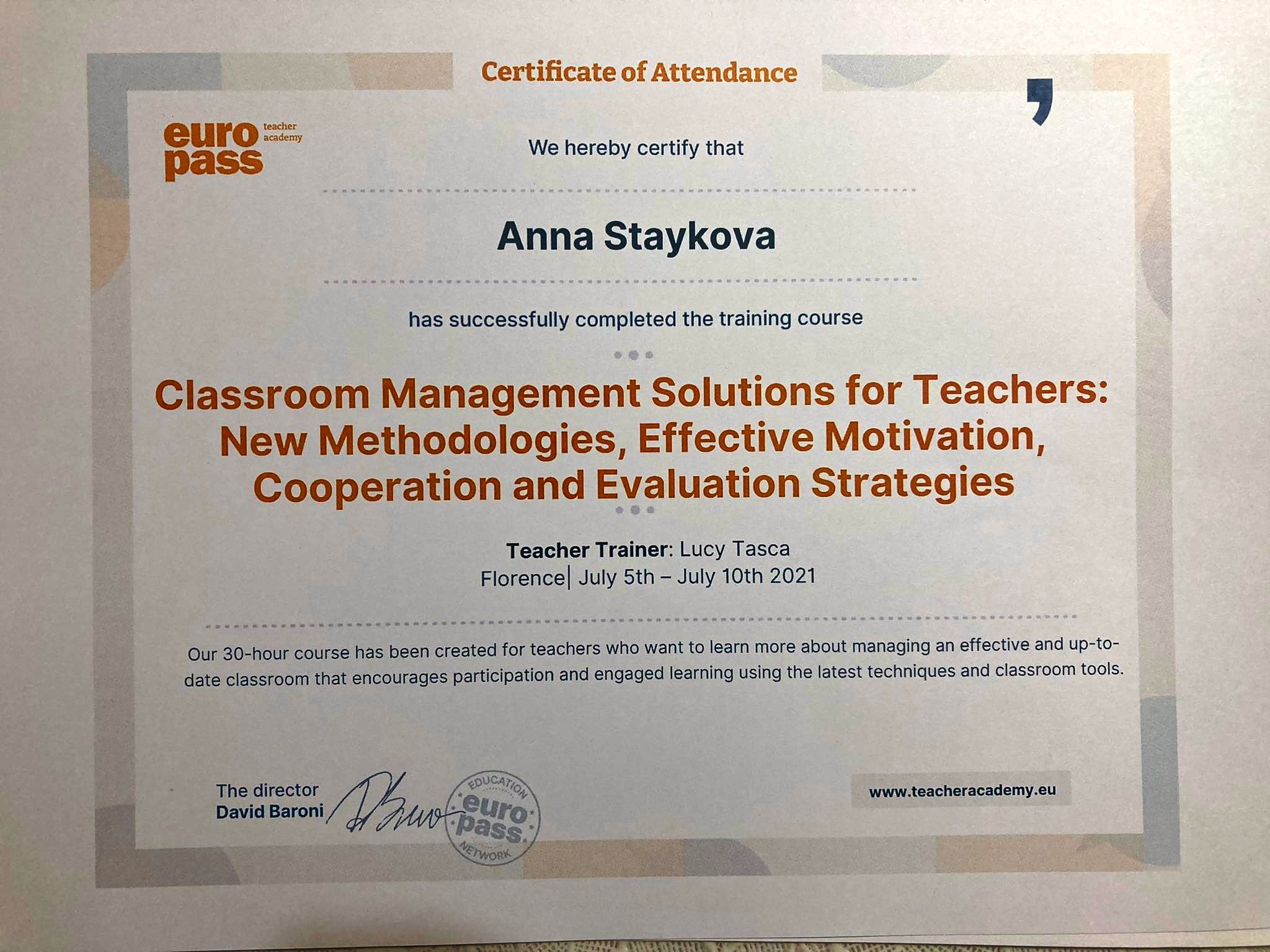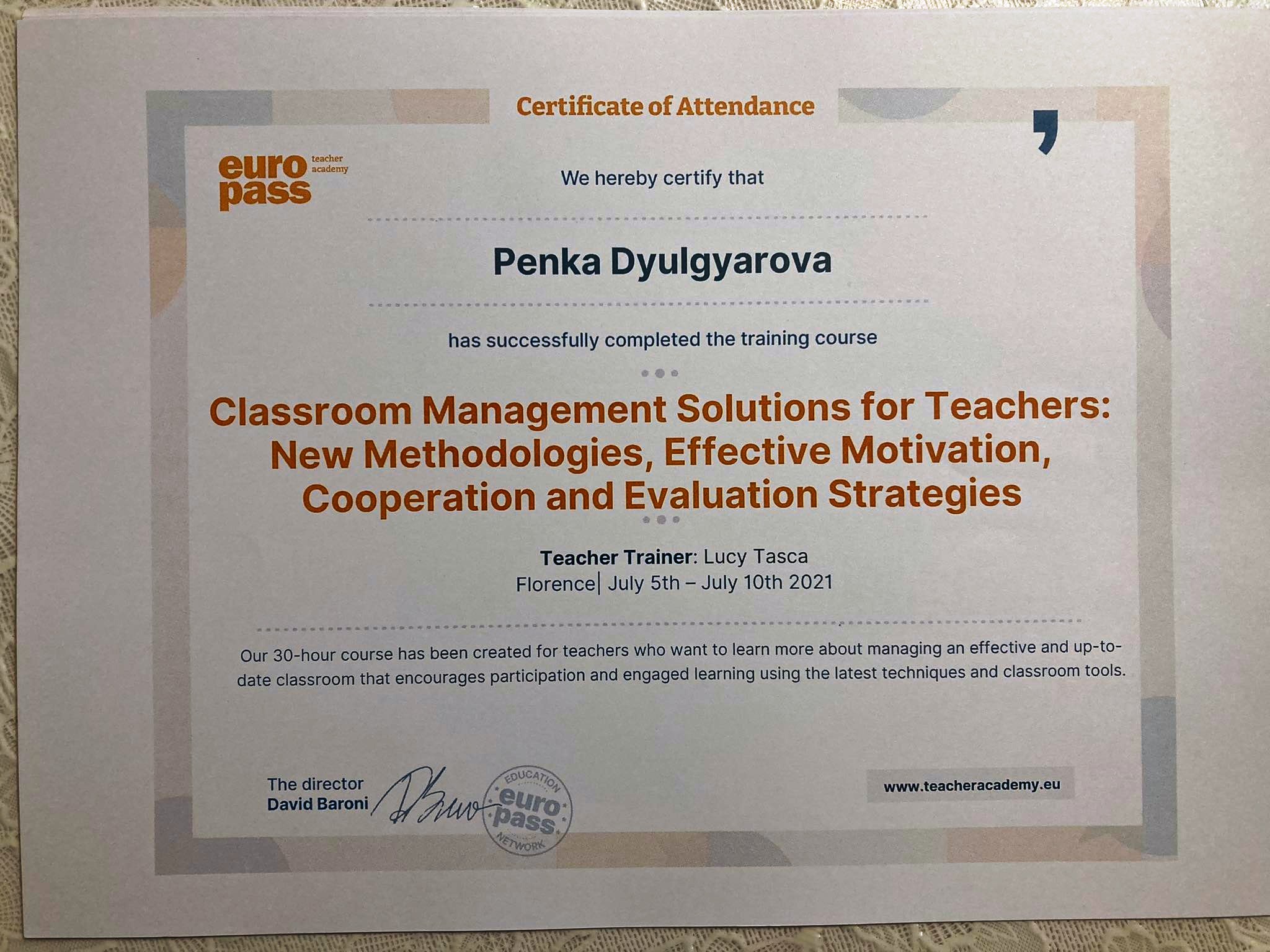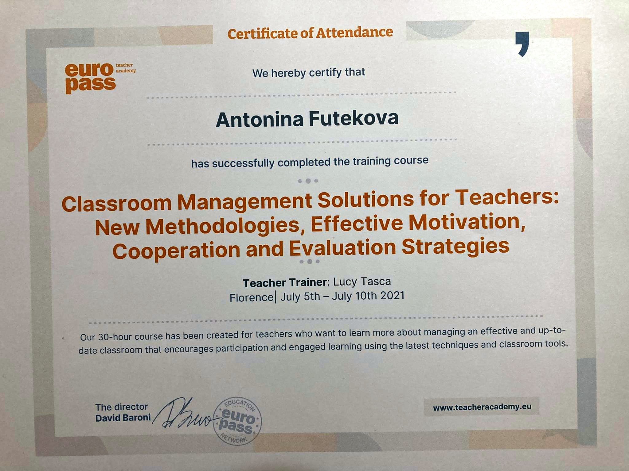 „Classroom Management Solutions for Teachers: new methodologies, effective motivation, cooperation and evaluation strategies“, Europass Teacher Academy, Florence – Four teachers joined the course, ideas for building interdisciplinary lessons and management solutions, 5-10 July 2021