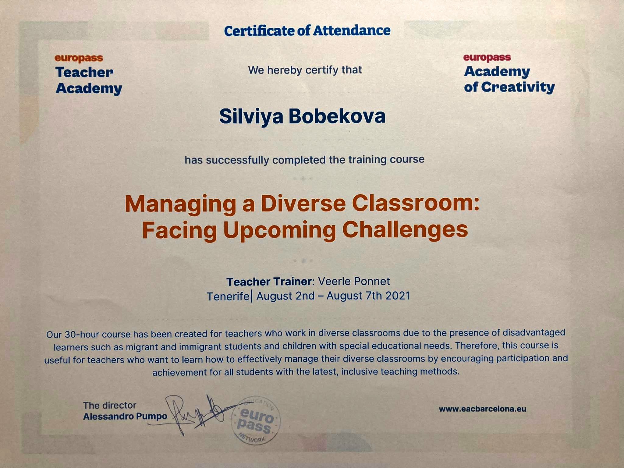 „Managing a diverse classroom: Facing upcoming challenges“, Europass Teacher Academy, Tenerife – a senior secondary English teacher was qualified, 2th -7th August 2021