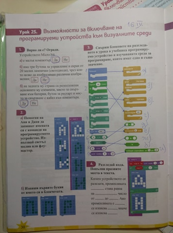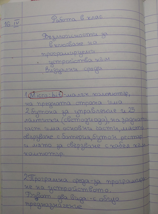 Децата свикнаха да работят по този начин, дойде ред да се преподава урок „Включване на програмируеми устройства към визуална среда“. Съществуват различни програмируеми устройства. Разбира се нашето училище закупи микрокомпютърните платки – Microbit. Чрез онлайн час показах устройството, обясних начина на работа и как се свързва с компютъра. След което им показах работа през платформата makecode.microbit.org. Демонстрирах им как мигат светлинките и как се изписват букви върху платката. Направихме сравнение на блоковете за програмиране на Scratch и на makecode.microbit.org и установихме, че те си приличат. Предоставим им план и кратко ръководство за домашна работа. Интересни и уникални проекти направиха четвъртокласниците, в симулатора на makecode.microbit.org.