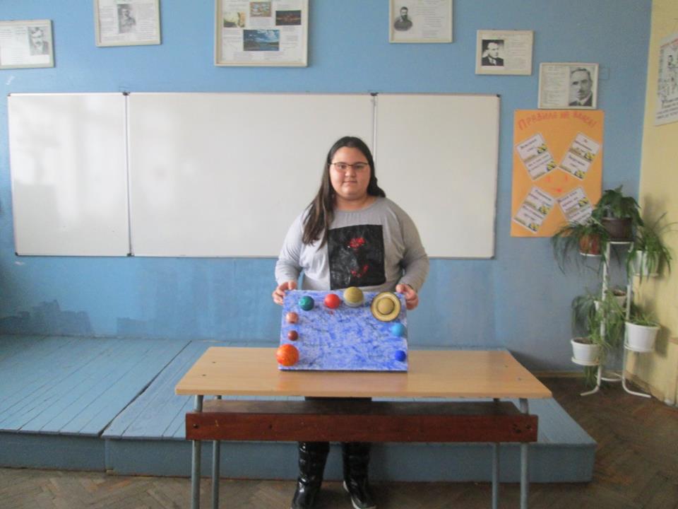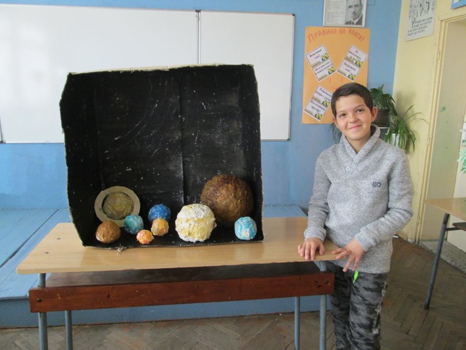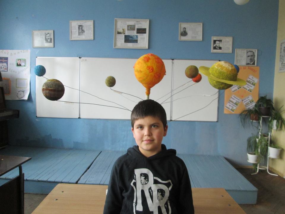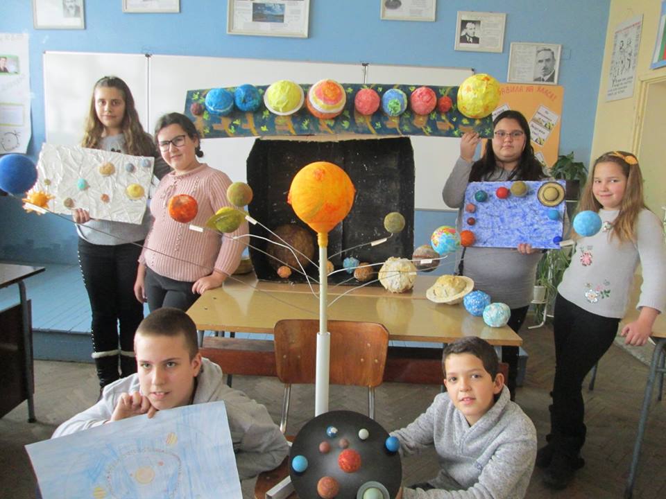 Слънчевата система, сътворена от сръчните ръце на петокласниците: Александър Денев, Десислава Яръмова, Дамяна Савова, Мария Цонева, Патрисия Иванова, Марин Тонев, и Ясен Христов