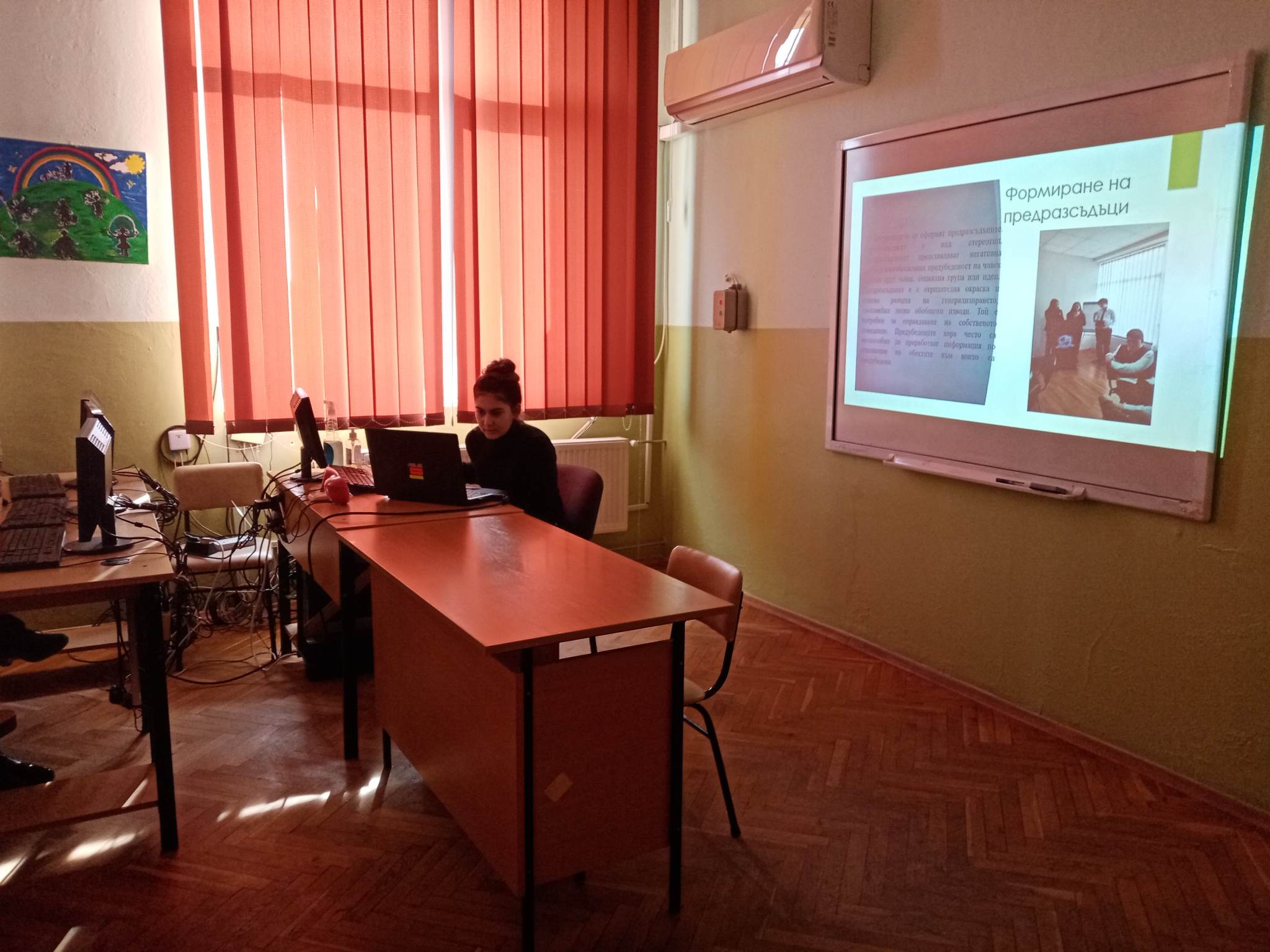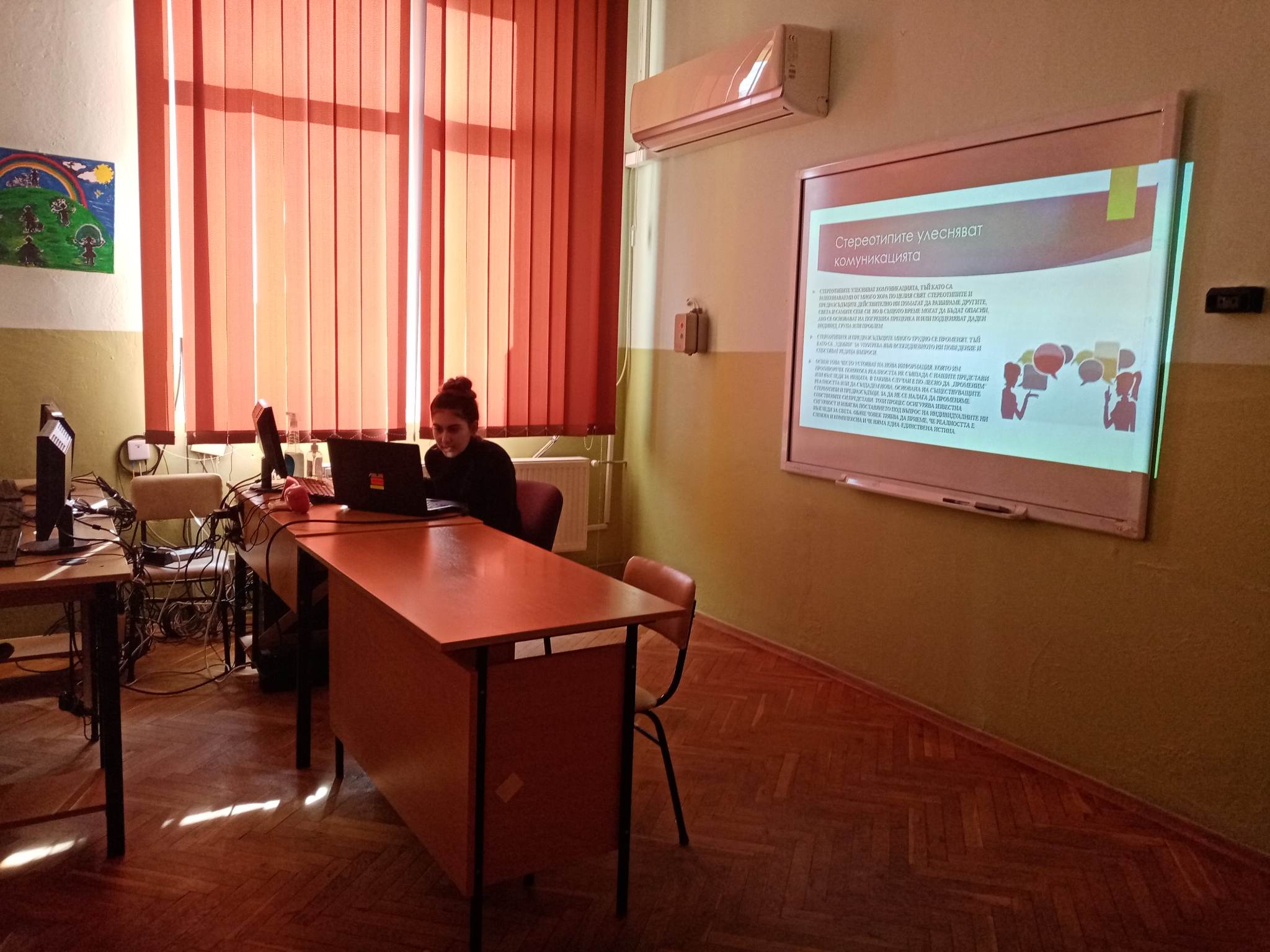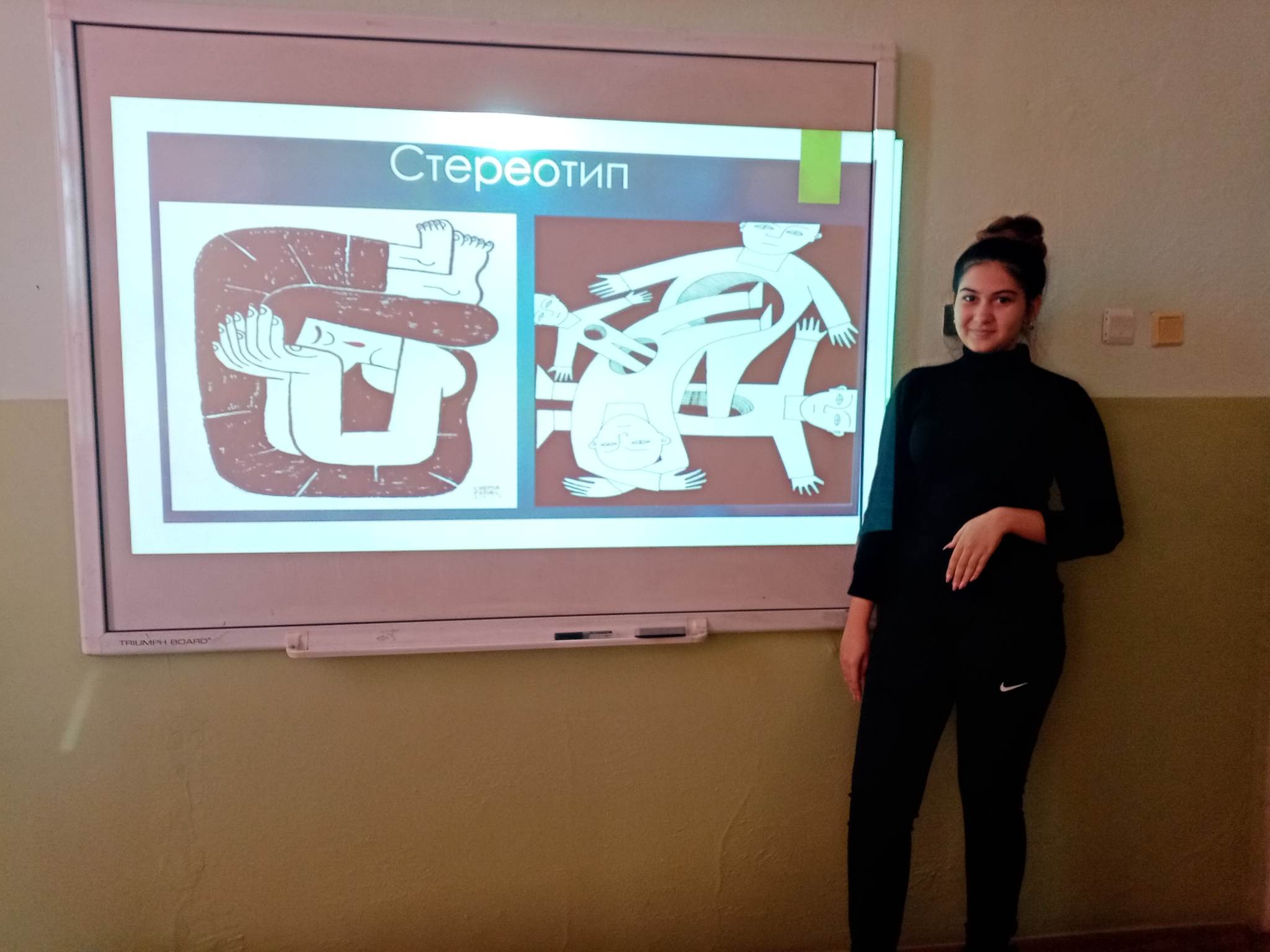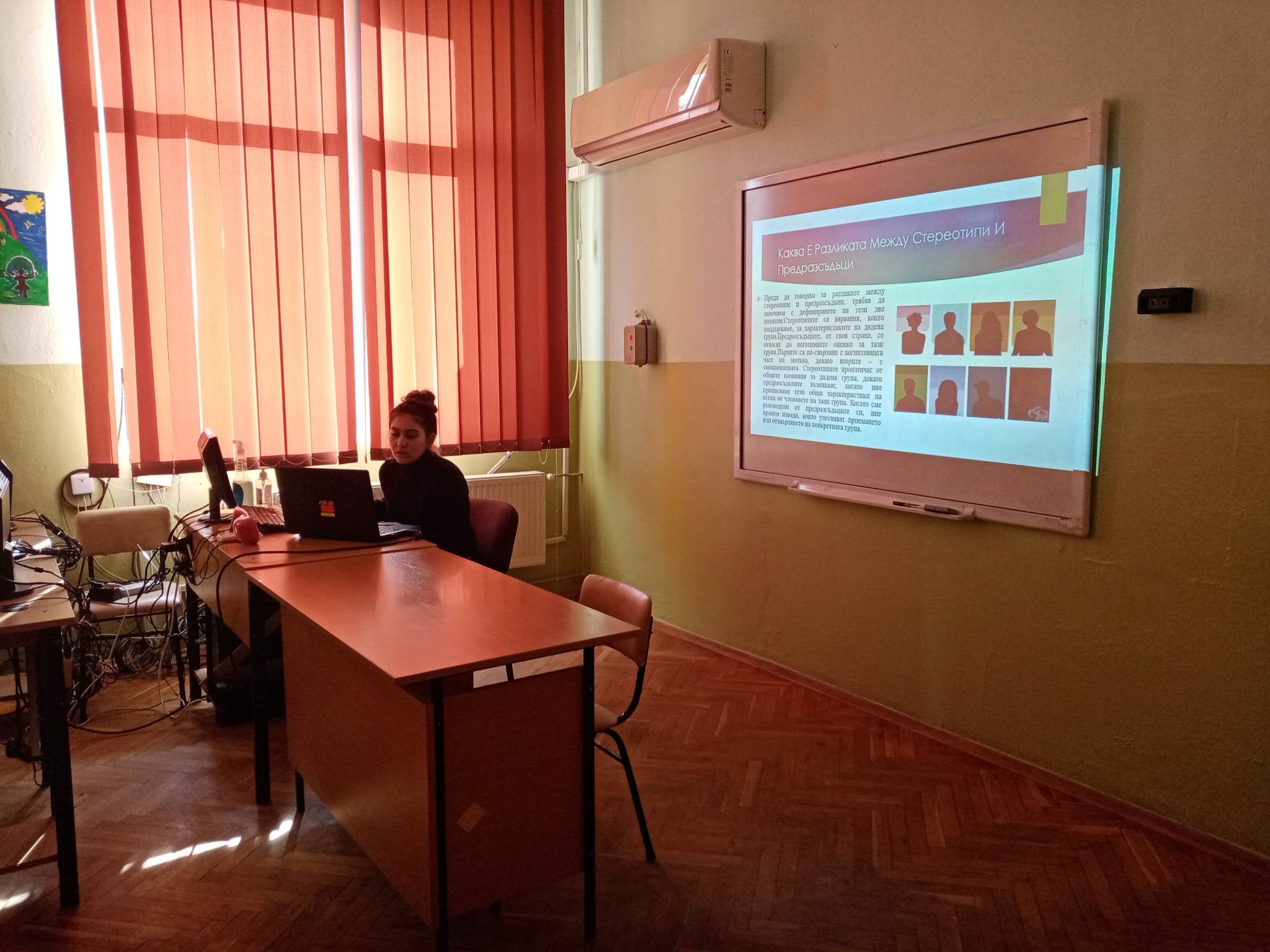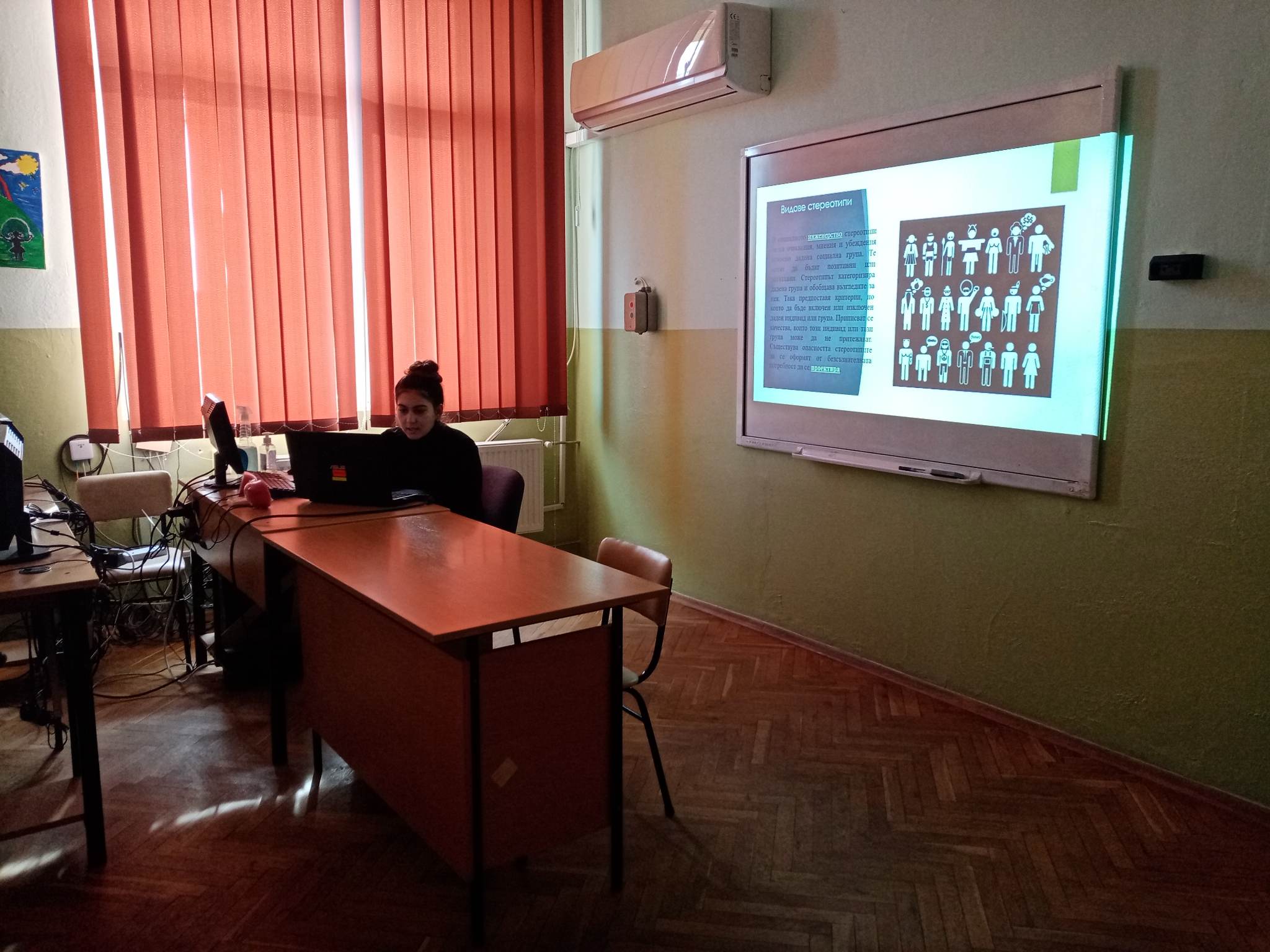Презентация „Стереотипи“ от Златина Султанова – член на Ученическия съвет бе представена пред ученици от прогимназиален и гимназиален етап. Бяха засегнати различните видове стереотипи и предразсъдъци, как са се формирали и начините им на проявление. В беседата след това се разисква темата за намаляване на влиянието на негативните предразсъдъци и стереотипи.