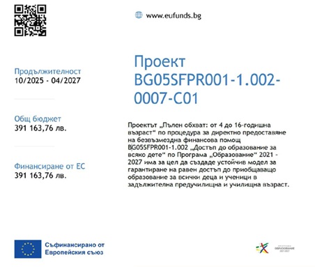 Професионална гимназия по земеделие е партньор на Регионално управление на образованието – Търговище по проект BG05SFPR001-1.002-0007-C01 „Пълен обхват: от 4 до 16-годишна възраст“ по процедура за директно предоставяне на безвъзмездна финансова помощ BG05SFPR001-1.002 „Достъп до образование за всяко дете“ по Програма „Образование“ 2021 – 2027.