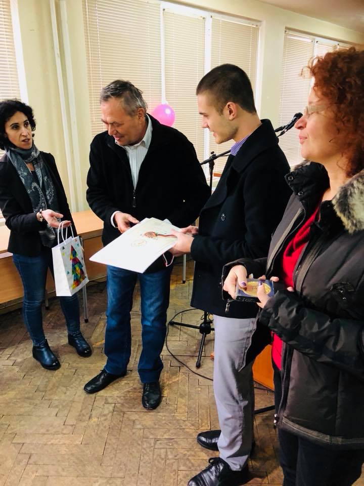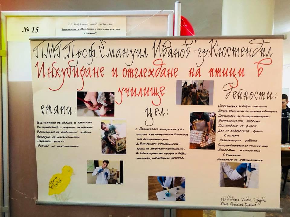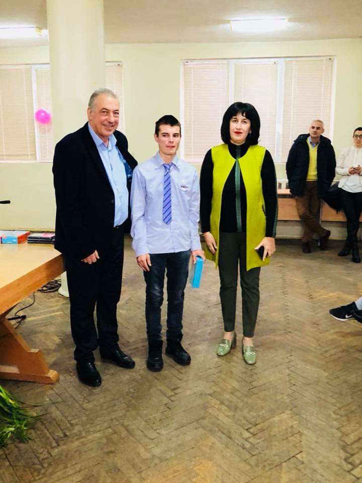 Венци Пасков връчи наградата на журито, която получи Николай Христов (XII клас) от ПМГ „Проф. Емануил Йорданов” – гр. Кюстендил, автор на темата „Инкубиране и отглеждане на птиците в училище”, с научен ръководител Силвия Русимова, както и отличието за първо място на Анастасия Генова (XII клас) oт 133-то СУ „А.С.Пушкин” – гр. София, за темата “Детектор на електромагнитни вълни – EMF_GHOST”, с научен ръководител Ралица Ранчова. За целта Община Видин бе предоставила таблети за победителите.